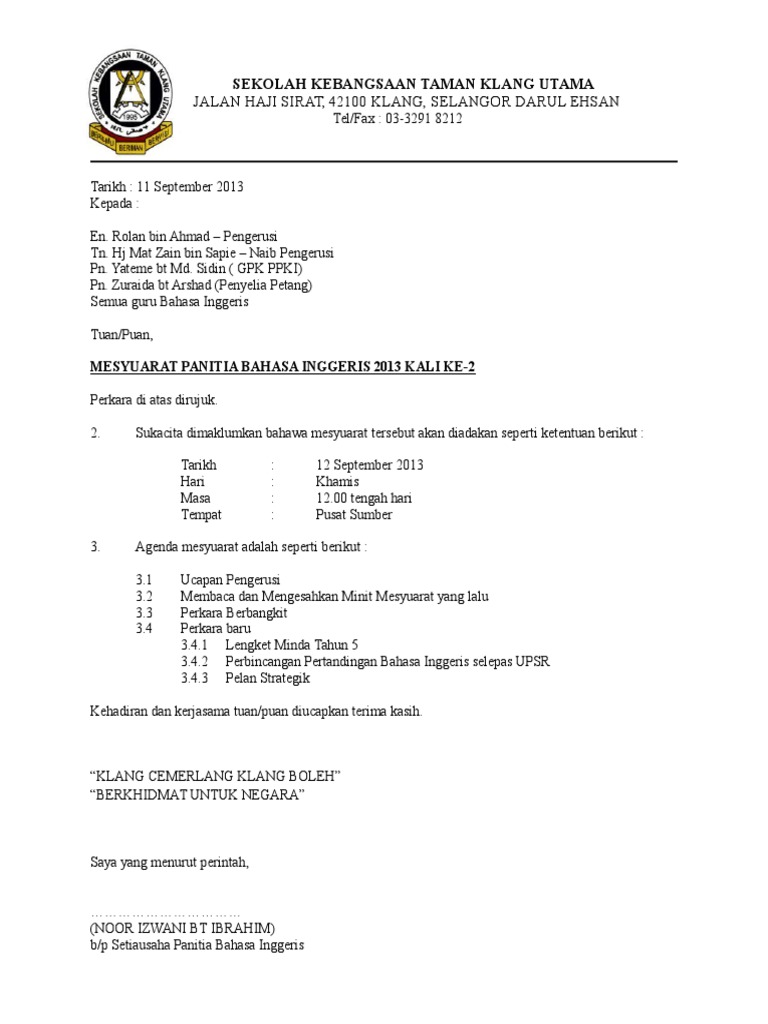 Contoh Surat Panggilan Mesyuarat Dalam Bahasa Inggeris Contoh Surat