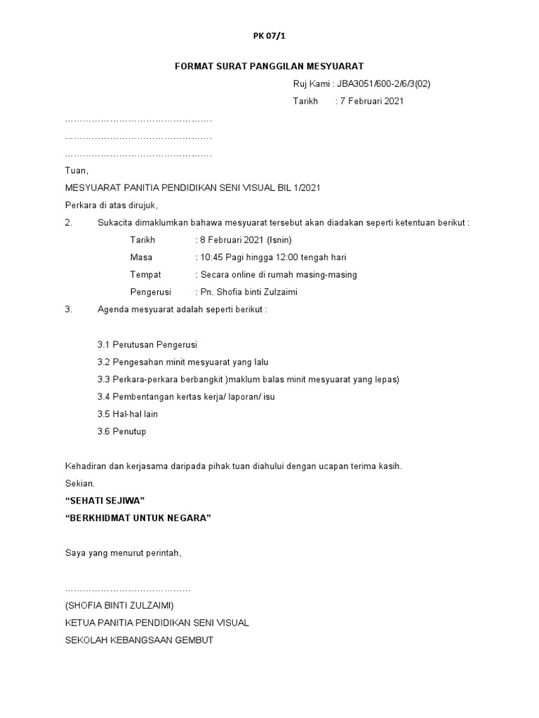 Format Surat Panggilan Mesyuarat Bil 1 2021 Pdf